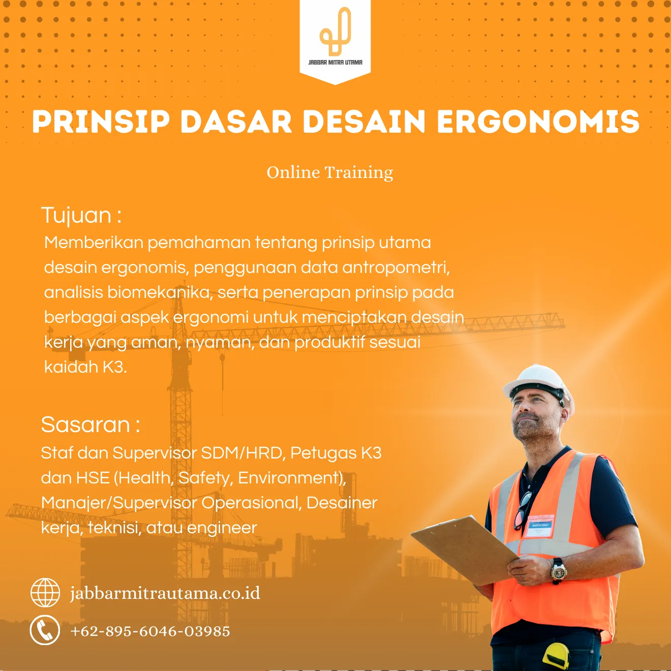Pelatihan Prinsip Dasar Desain Ergonomis membahas pemahaman mendalam mengenai prinsip utama dalam merancang desain kerja yang aman dan nyaman. Materi meliputi penggunaan data antropometri, analisis biomekanika, serta penerapan prinsip ergonomi pada berbagai aspek desain kerja. Dengan pemahaman ini, peserta diharapkan mampu menciptakan lingkungan kerja yang produktif sekaligus sesuai dengan kaidah K3 (Keselamatan dan Kesehatan Kerja).