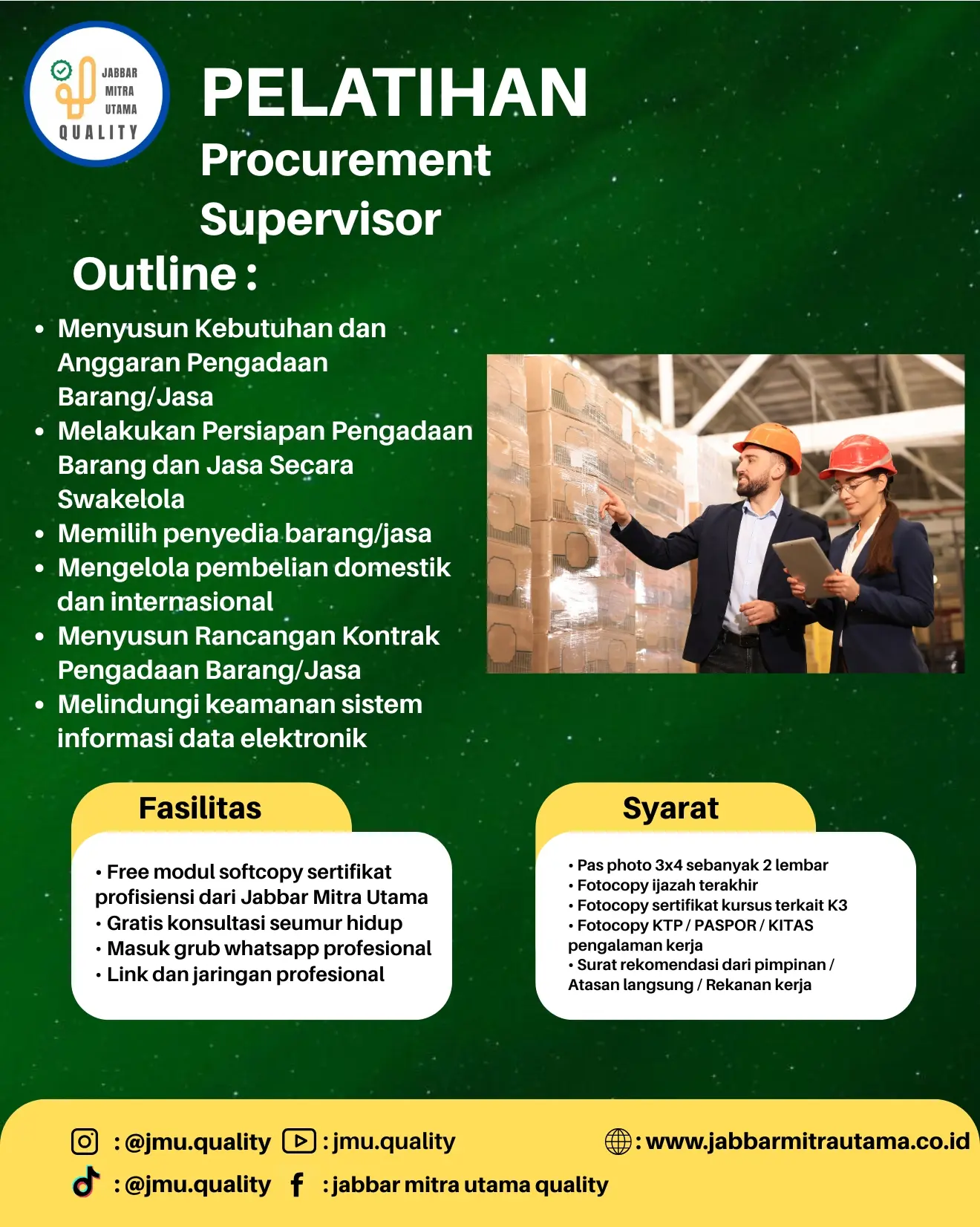 Pelatihan Procurement Supervisor ini dirancang untuk membekali peserta dengan pengetahuan dan keterampilan dalam mengelola proses pengadaan barang dan jasa secara efektif, transparan, dan sesuai dengan kebutuhan organisasi. Peserta akan mempelajari langkah-langkah menyusun kebutuhan dan anggaran, melakukan persiapan pengadaan, serta memilih penyedia barang/jasa yang tepat dan terpercaya.