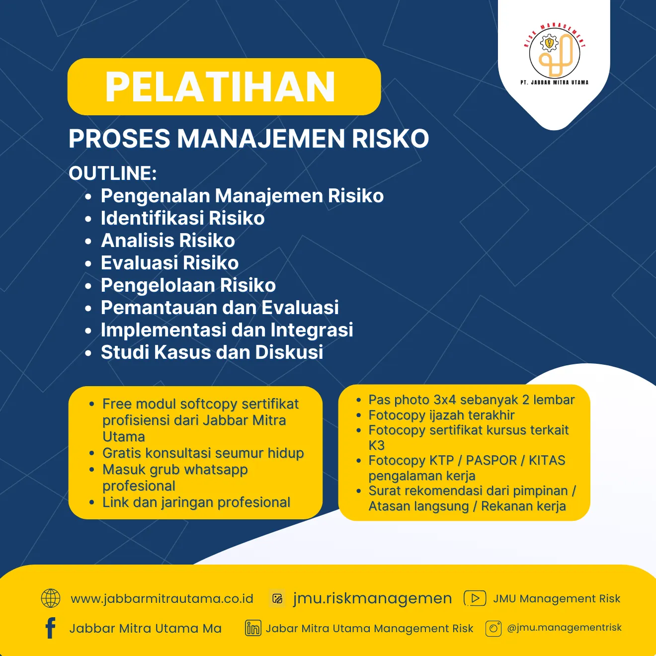 Pelatihan Proses Manajemen Risiko ini dirancang untuk memberikan pemahaman menyeluruh mengenai konsep, prinsip, dan tahapan dalam mengelola risiko di berbagai organisasi. Peserta akan dibekali dengan teori serta praktik langsung terkait proses identifikasi, analisis, evaluasi, hingga pengendalian risiko sesuai dengan standar terbaik manajemen risiko.
