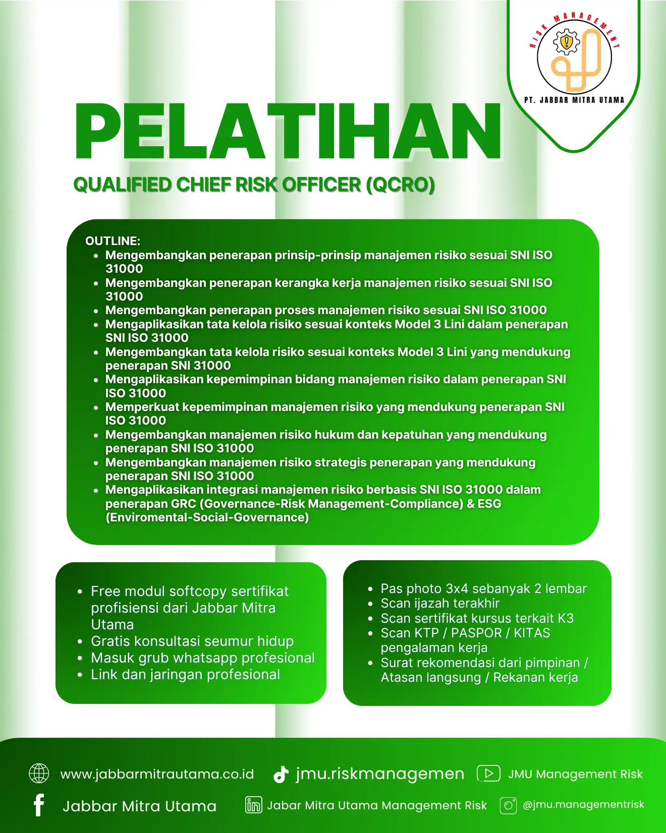 Pelatihan Qualified Chief Risk Officer (QCRO) merupakan program lanjutan yang dirancang untuk para profesional, manajer risiko, maupun eksekutif yang ingin menguasai implementasi manajemen risiko secara strategis dan menyeluruh sesuai dengan standar SNI ISO 31000. Pelatihan ini menitikberatkan pada penguatan peran Chief Risk Officer dalam menyusun tata kelola risiko organisasi yang berkelanjutan dan terintegrasi dengan konsep GRC (Governance-Risk Management-Compliance) dan ESG (Environmental-Social-Governance).