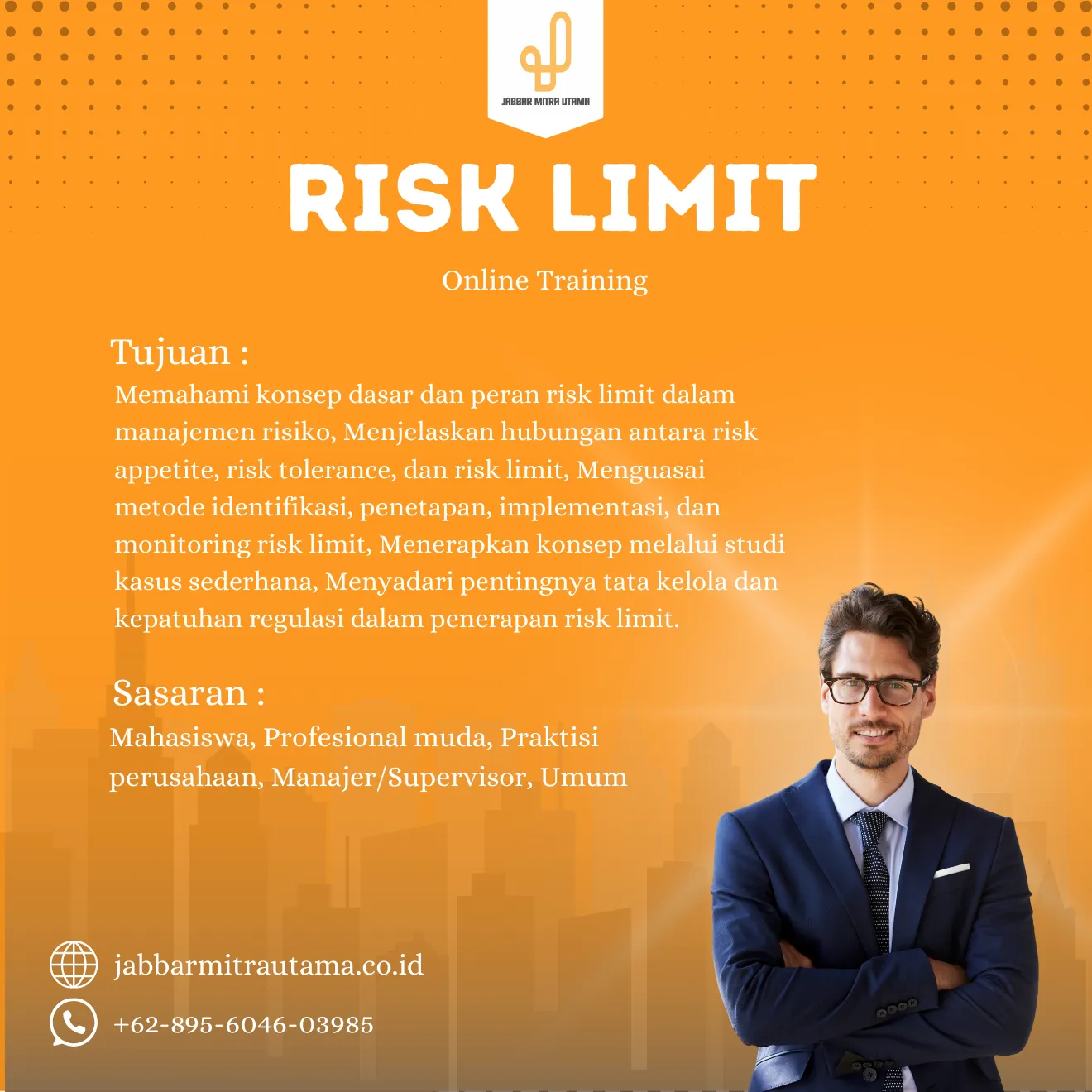 Pelatihan Risk Limit adalah program online yang dirancang untuk memberikan pemahaman menyeluruh mengenai konsep batas risiko dalam manajemen risiko. Peserta akan mempelajari hubungan antara risk appetite, risk tolerance, dan risk limit serta menguasai teknik identifikasi, penetapan, implementasi, hingga monitoring risk limit. Dengan studi kasus sederhana, peserta juga akan dilatih untuk menerapkan konsep ini secara praktis serta memahami pentingnya tata kelola dan kepatuhan regulasi dalam penerapan risk limit.