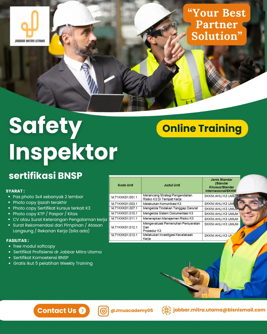 Pelatihan Safety Inspektor adalah program kompetensi berbasis standar nasional (SKKNI Ahli K3 Umum) yang dirancang untuk mempersiapkan peserta menjadi tenaga ahli yang mampu melakukan inspeksi, evaluasi, dan pengawasan terhadap pelaksanaan Keselamatan dan Kesehatan Kerja (K3) di lingkungan kerja.