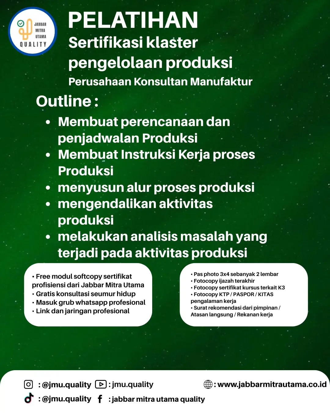 Pelatihan ini dirancang khusus bagi para profesional di bidang manufaktur untuk mengembangkan kompetensi dalam merencanakan, mengelola, dan mengevaluasi aktivitas produksi. Melalui pelatihan ini, peserta akan dibekali dengan keterampilan teknis dan praktis dalam menyusun instruksi kerja, mengontrol proses produksi, serta menganalisis masalah yang muncul di lapangan. Program ini sangat cocok untuk supervisor produksi, staf perencanaan, atau manajer operasional di sektor industri manufaktur.