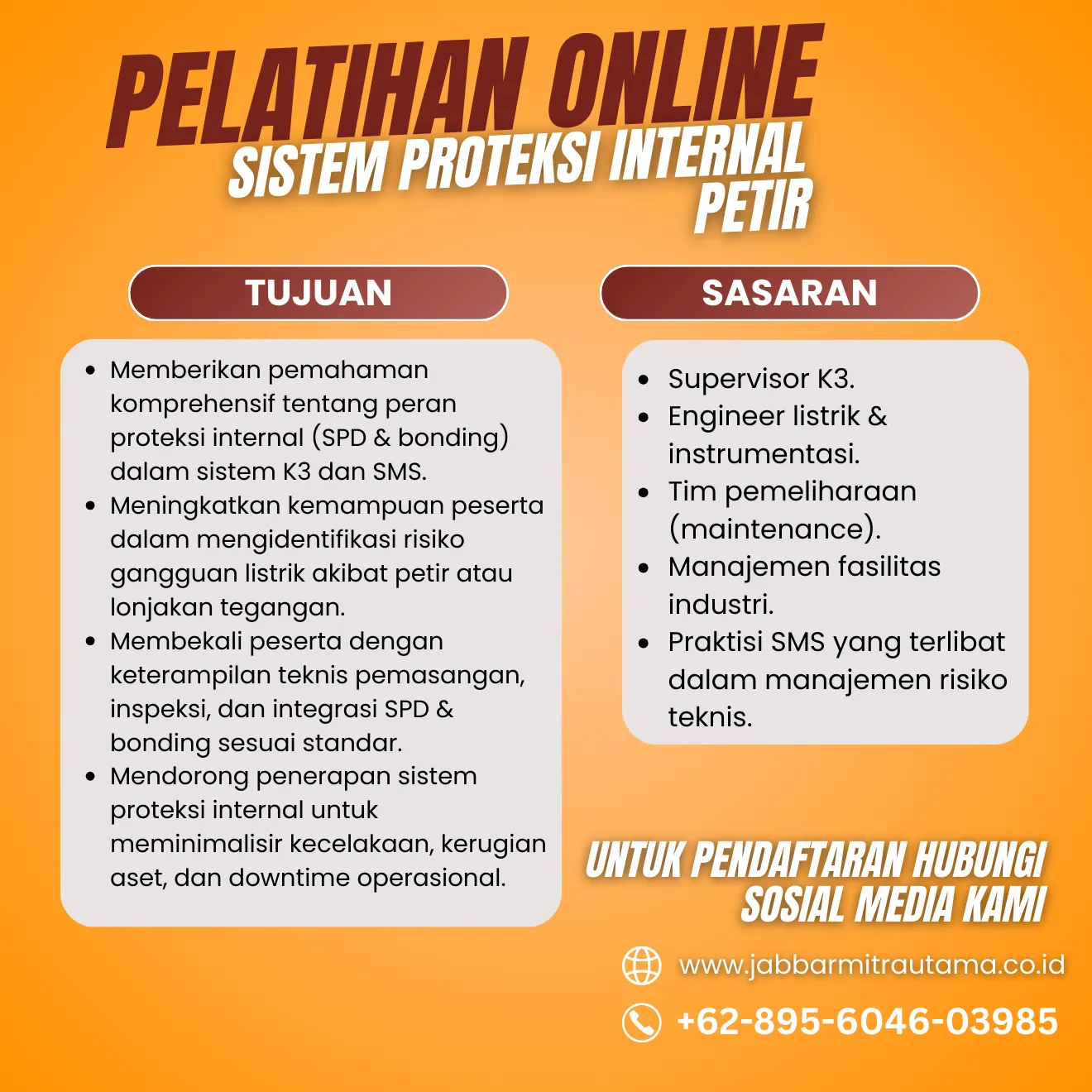Proteksi internal petir (SPD & bonding) merupakan elemen penting dalam mencegah gangguan listrik akibat sambaran petir maupun lonjakan tegangan. Pelatihan ini dirancang untuk memberikan pemahaman menyeluruh terkait peran proteksi internal dalam mendukung sistem K3 dan Safety Management System (SMS). Peserta akan dibekali keterampilan teknis pemasangan, inspeksi, serta integrasi SPD & bonding sesuai standar, guna mendukung keselamatan, keandalan, dan keberlangsungan operasional.