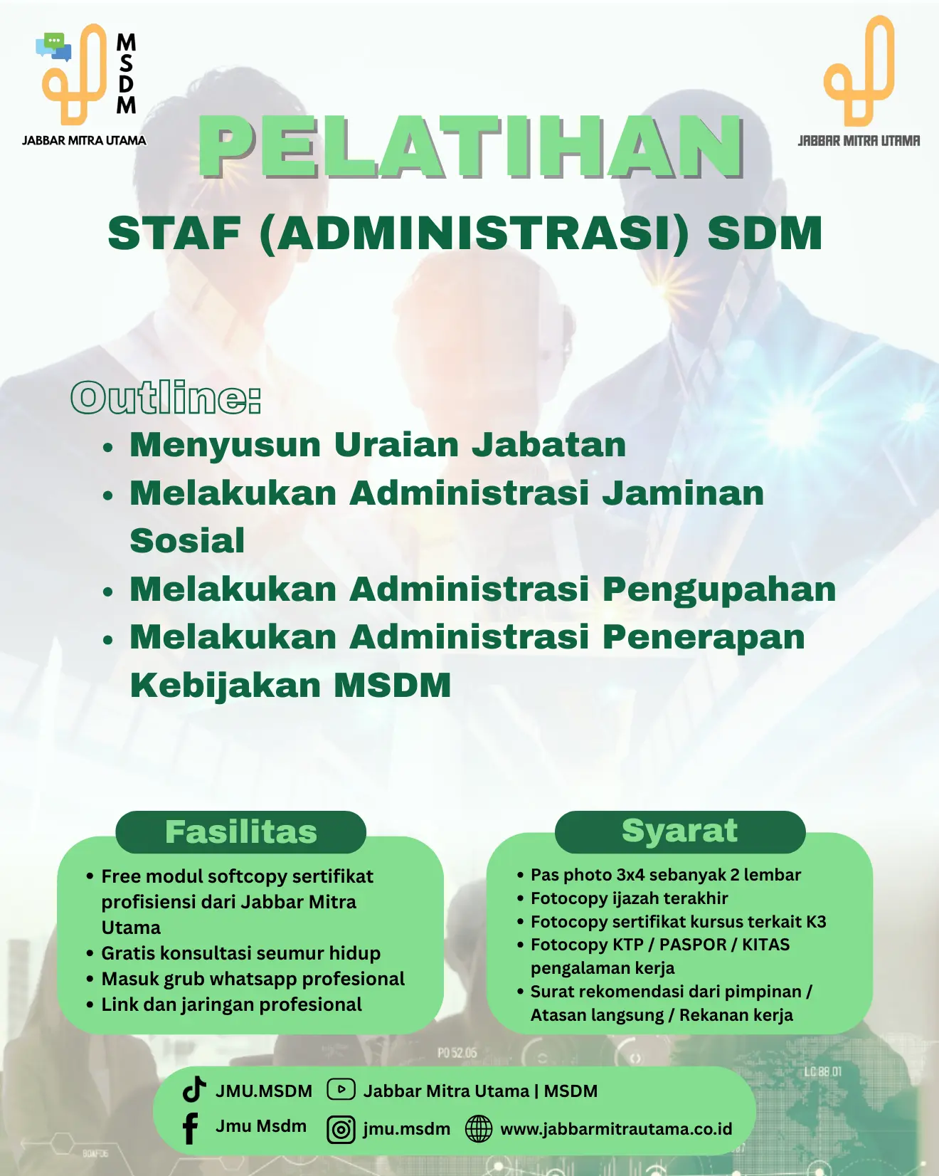 Pelatihan Staf (Administrasi) SDM ini dirancang untuk membekali peserta dengan keterampilan dasar administrasi sumber daya manusia yang dibutuhkan dalam mendukung operasional perusahaan. Peserta akan mempelajari cara menyusun uraian jabatan yang sistematis, melaksanakan administrasi jaminan sosial, serta mengelola administrasi pengupahan sesuai aturan yang berlaku.