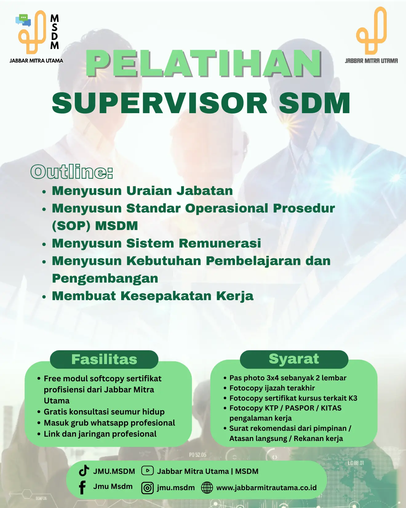 elatihan Supervisor SDM ini dirancang untuk membekali peserta dengan kemampuan dalam mengelola administrasi dan operasional sumber daya manusia secara profesional. Peserta akan mempelajari teknik menyusun uraian jabatan yang sistematis, membuat dan menerapkan Standar Operasional Prosedur (SOP) MSDM, serta menyusun sistem remunerasi yang adil dan sesuai kebutuhan organisasi.