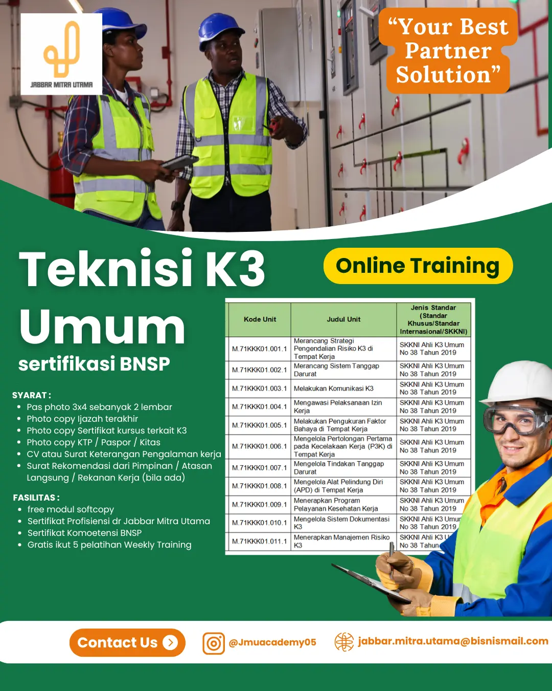 Teknisi K3 Umum adalah seorang profesional yang bertanggung jawab untuk memastikan penerapan sistem Keselamatan dan Kesehatan Kerja (K3) di tempat kerja berjalan dengan baik, serta mengidentifikasi, mengendalikan, dan mengurangi potensi bahaya yang dapat mengancam keselamatan pekerja. Teknisi K3 Umum memiliki peran penting dalam mengawasi dan menjaga keselamatan di berbagai sektor industri, baik itu di pabrik, konstruksi, maupun di lingkungan kerja lainnya.