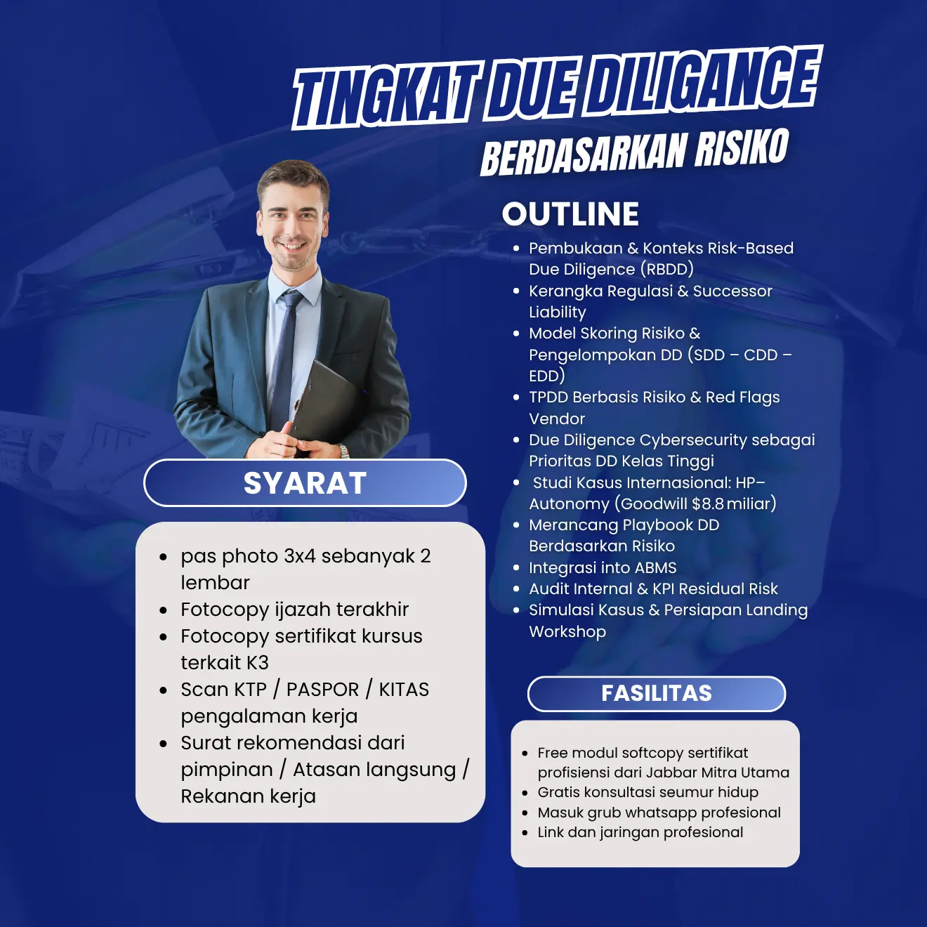 Pelatihan ini memberikan pemahaman komprehensif tentang penerapan due diligence berbasis risiko (Risk-Based Due Diligence). Fokus utama pelatihan mencakup regulasi, pemodelan skoring risiko, pengelompokan DD (SDD, CDD, EDD), praktik red flags vendor, hingga integrasi dalam sistem ABMS dan evaluasi KPI.