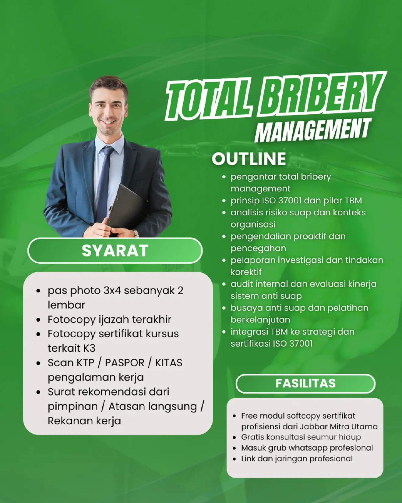 Pelatihan Total Bribery Management (TBM) adalah program e-learning komprehensif yang dirancang untuk membekali peserta dengan pengetahuan dan keterampilan dalam mencegah, mendeteksi, dan menangani praktik suap sesuai standar internasional ISO 37001. Pelatihan ini mencakup pendekatan holistik mulai dari analisis risiko, pengendalian proaktif, hingga integrasi sistem anti-suap ke dalam strategi organisasi.
