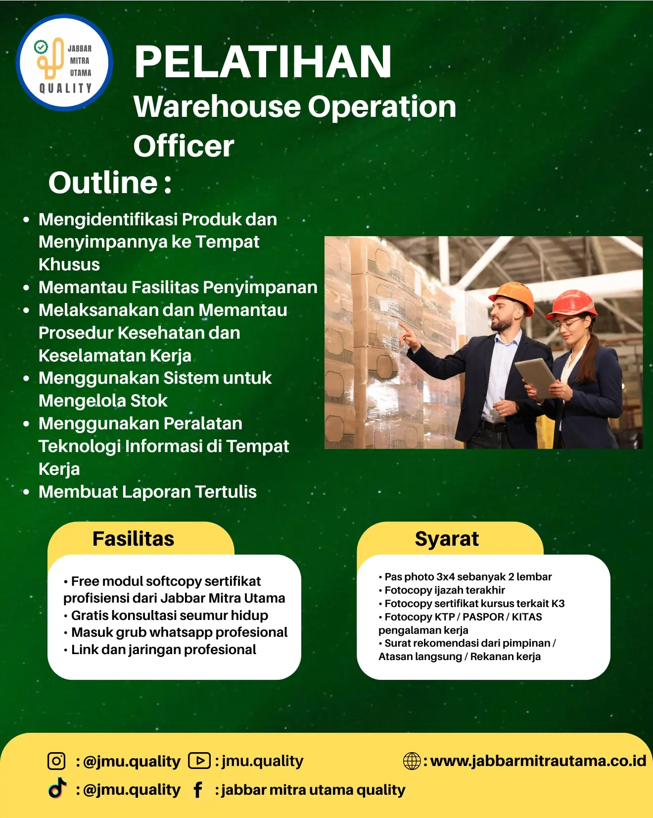 Pelatihan Warehouse Operation Officer ini dirancang untuk membekali peserta dengan pengetahuan dan keterampilan dalam mengelola operasional gudang secara efektif dan efisien. Peserta akan mempelajari teknik mengidentifikasi produk, menyimpannya ke tempat khusus sesuai standar, serta memantau fasilitas penyimpanan agar kualitas dan keamanan barang tetap terjaga.