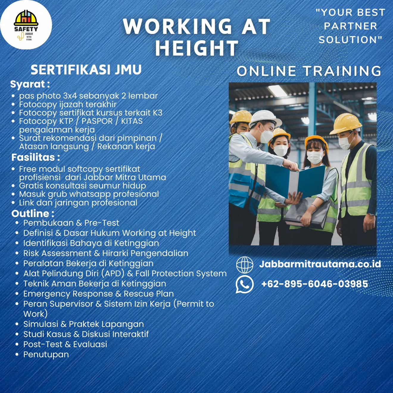 Pelatihan ini merupakan program online training yang dirancang untuk meningkatkan kompetensi tenaga kerja dalam melakukan pekerjaan di ketinggian secara aman. Pekerjaan di ketinggian memiliki risiko tinggi terhadap kecelakaan kerja, sehingga diperlukan pemahaman menyeluruh mengenai identifikasi bahaya, penilaian risiko, hingga penerapan teknik bekerja yang sesuai standar K3.